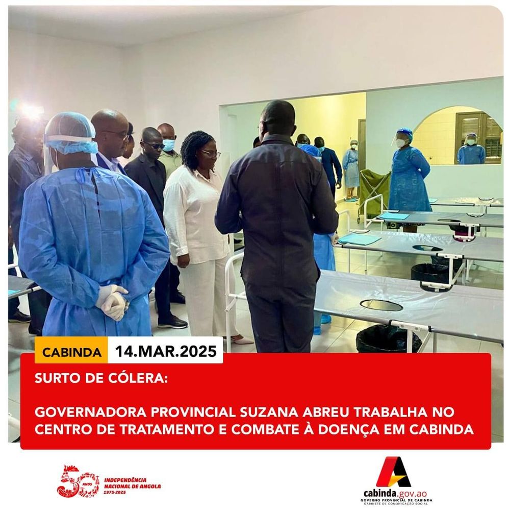 A Província de Cabinda conta com 6 casos registados de cólera e 1 óbito. A Governadora Provincial de Cabinda, Suzana Abreu, trabalhou na tarde desta Sexta-feira, 14 de Março de 2025, no Centro de Tratamento de Cólera (CTC) localizado no Tchizo, arredores da cidade de Cabinda, com o objectivo de avaliar as medidas adoptadas para o combate à doença na Província.