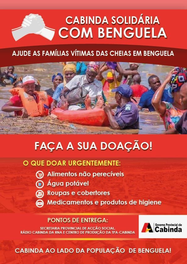 O Governo Provincial de Cabinda lançou a campanha solidária de recolha de donativos, denominada “Abraço Solidário Benguela”, que tem lugar nesta Quarta-feira, 15 de Abril, em apoio às famílias afectadas pelas recentes cheias provocadas pelo rompimento do dique de protecção do rio Cavaco, na Província de Benguela.