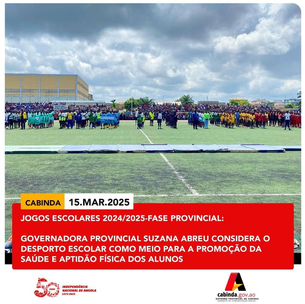 A Governadora Provincial de Cabinda, Suzana Abreu, procedeu à abertura, este Sábado, 15 de Março de 2025, no Estádio Municipal do Tafe, da 13ª Edição dos Jogos Escolares 2024/2025-Fase Provincial, sob o lema "Angola 50 Anos da Independência Nacional: Preservar e Valorizar as Conquistas Alcançadas, Construindo Um Futuro Melhor"