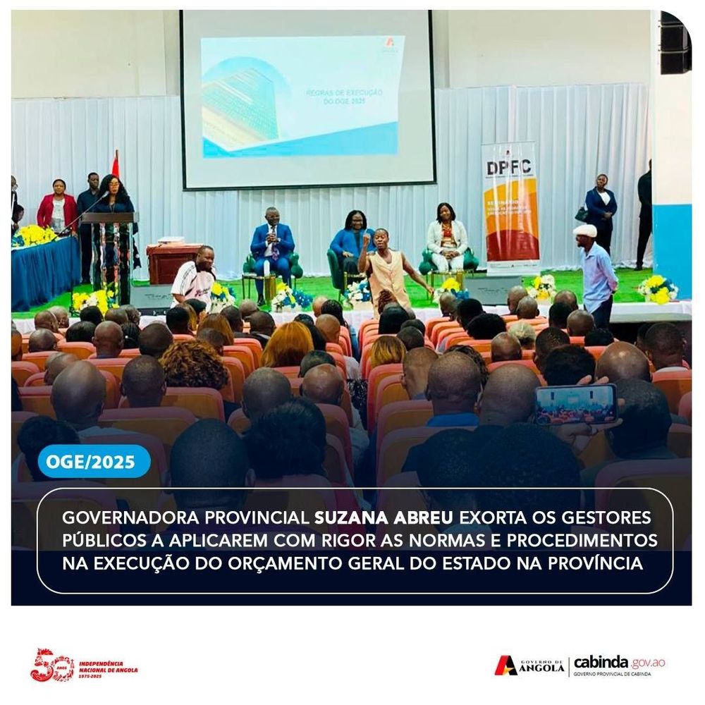 A Governadora de Cabinda, Suzana Abreu, exortou, nesta Quinta-feira, 24 de Abril de 2025, os gestores públicos a aplicarem rigorosamente as normas e procedimentos na execução do Orçamento Geral do Estado (OGE) na Província.