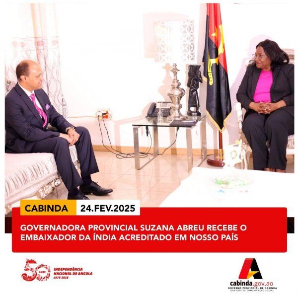 A Governadora Provincial de Cabinda, Suzana Abreu, recebeu na manhã desta Segunda-feira, 24 de Fevereiro de 2025, no Governo Provincial, o Embaixador da Índia acreditado em Angola, Vidhu Nair.